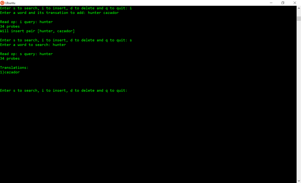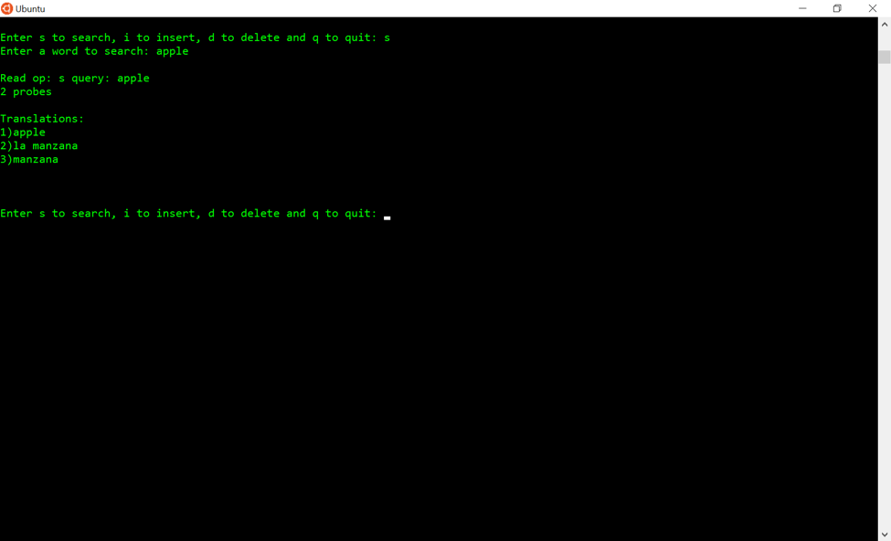 If the user selects the search option, they will be asked for a word to search for. As shown above, if the word is found, the number of required probes is shown, along with the translations. If the word is not found, the user will be informed that the word was not found and the number of probes required to complete the search.