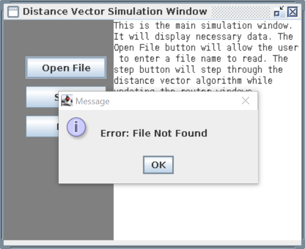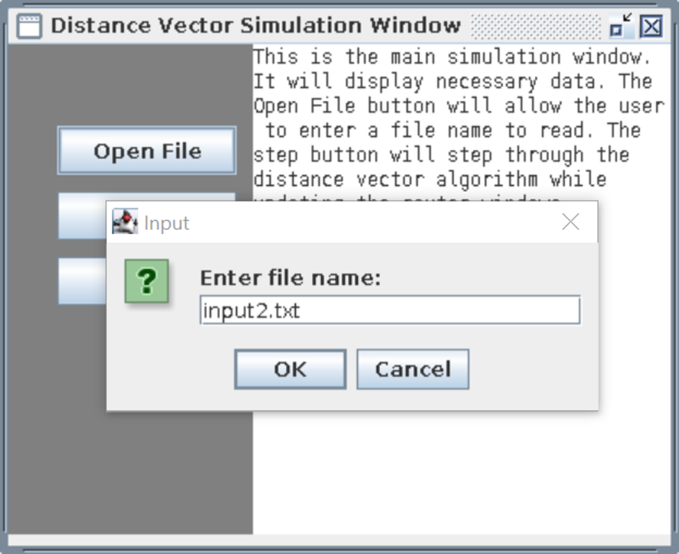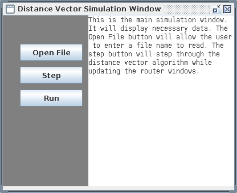 Once run, the first window shows 3 options for the user. The open file button allows the user to enter the name of the input text file to be read. The step button runs the algorithm one step at a time and the run button runs the algorithm until the system of routers is stable.