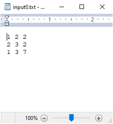 Below is an example of an input file. The file contains 3 colums. The first two columns are the ID’s of two routers and the third column is the distance between the two routers.