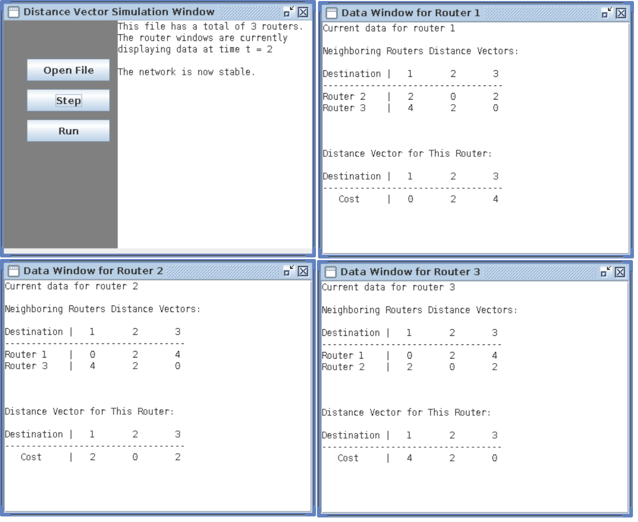 Finally, once the step button is clicked again, the windows will update as shown above. You can see that the updated vectors for routers 1 and 3 are now reflected on all router windows. The main window has also updated with a time value of 2, meaning two iterations were required. There is also a message to indicate that the system is now stable.