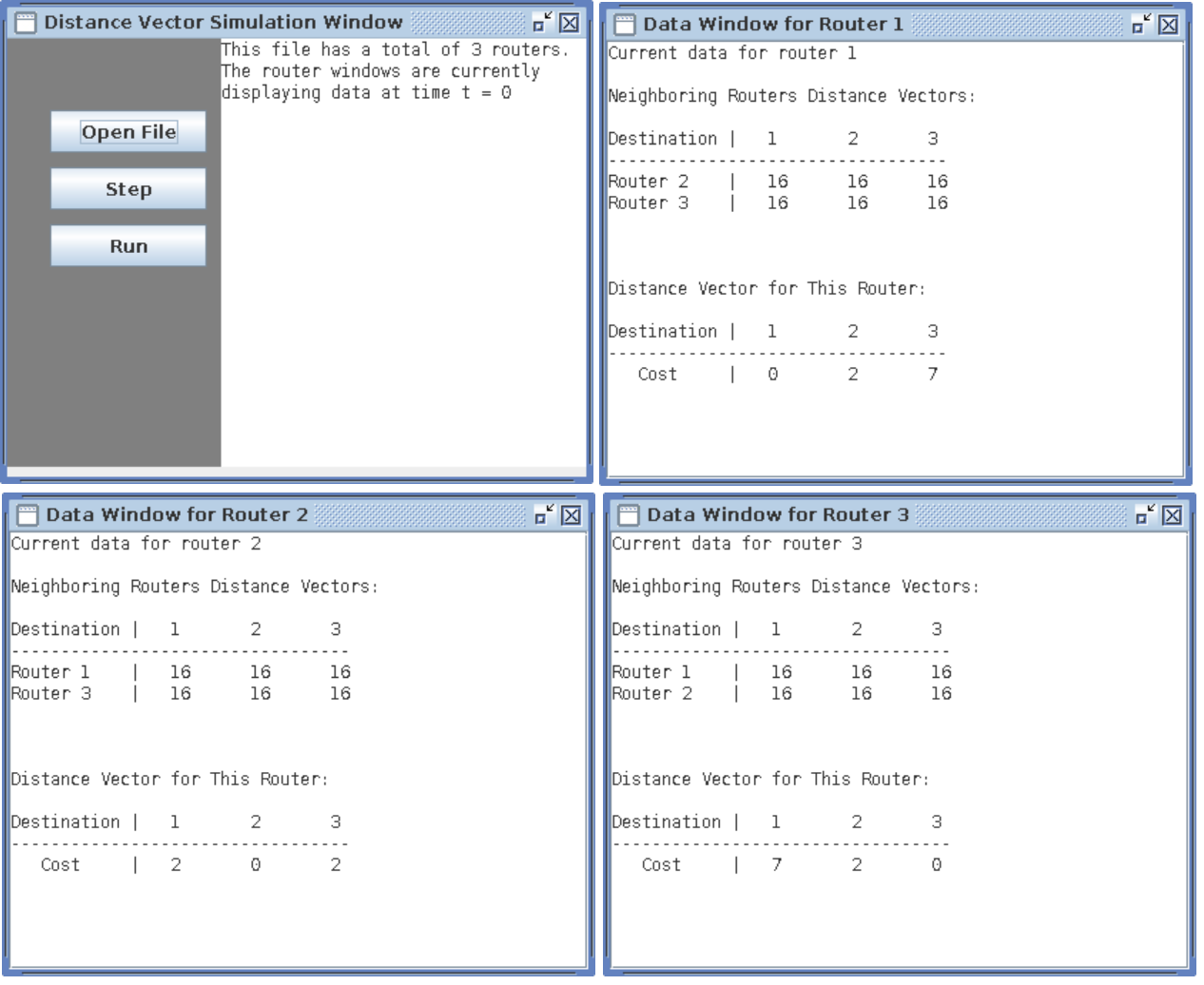 As the image above shows, once a valid file is given, the program will open a window for each router while also updating the data in the main window. Each router window will display any directly connected routers and the distance vectors for those routers. (16 in this case represents infinity since each router has not received any information from any other routers. Also, the window shows that the distance from each router to itself is zero. The lower portion of the router window shows the distance vector for that router. The main window displays the total number of routers and the t value, which represents time.